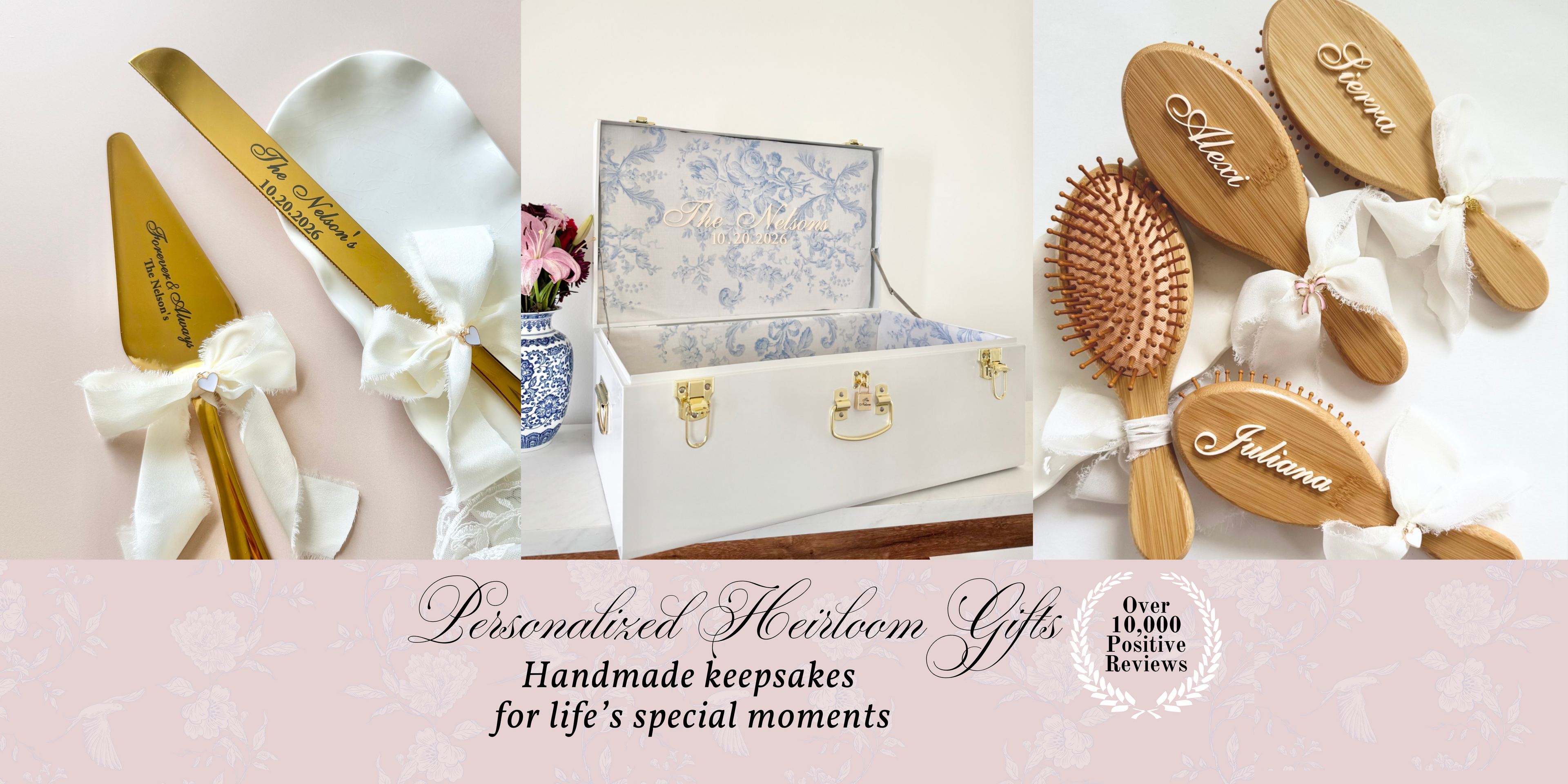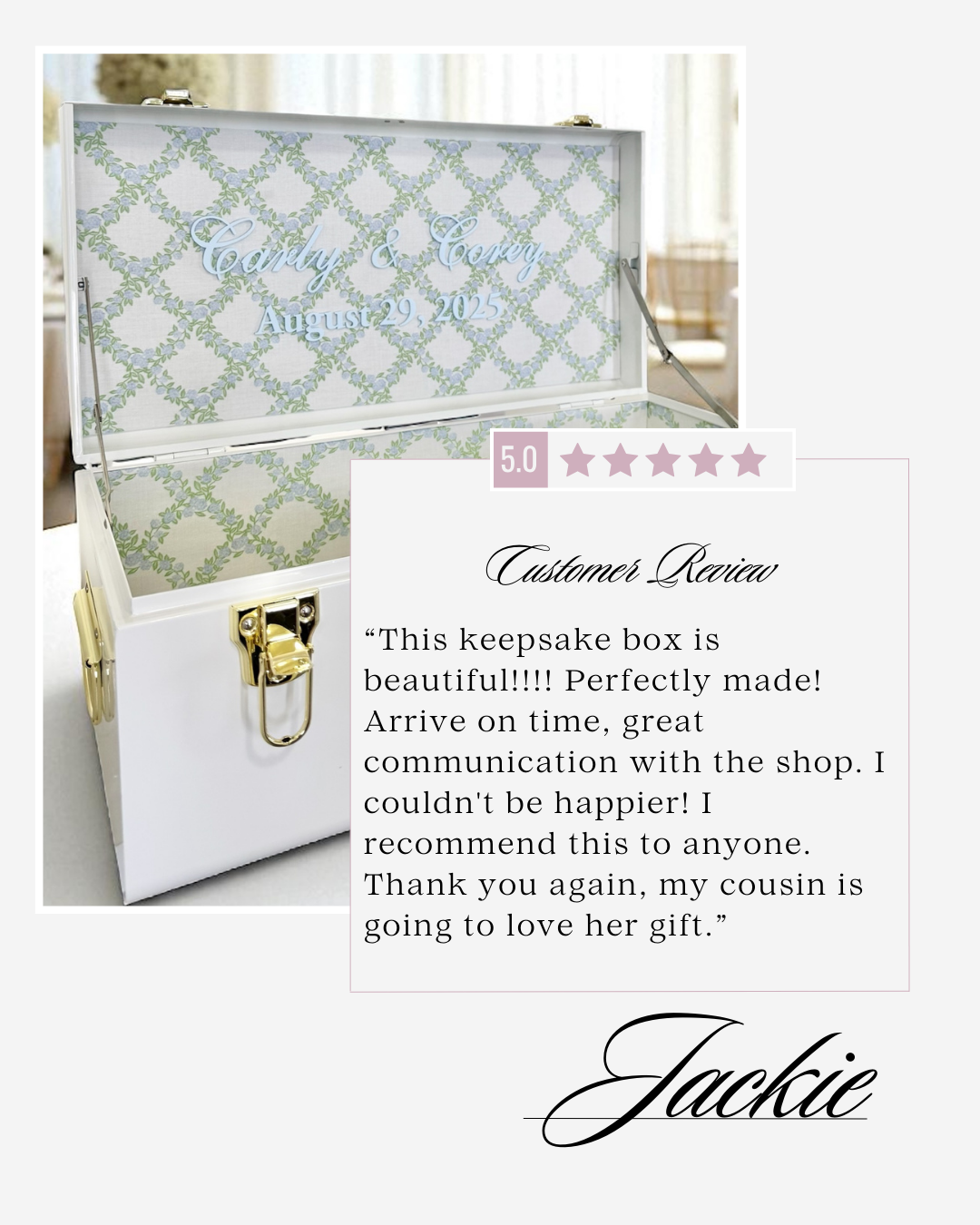 "This keepsake chest is phenomenal and beautiful! It’s hard to find nice quality items that you can keep forever these days but this is definitely one! Great quality and was packed amazingly! I’ve never seen anything wrapped and packed so well. Not a single scratch was on it when received. I’m so excited to put our wedding items in it as a beautiful keepsake and then one day pass it down. Thank you!!!" -Allison, 2026 Bride