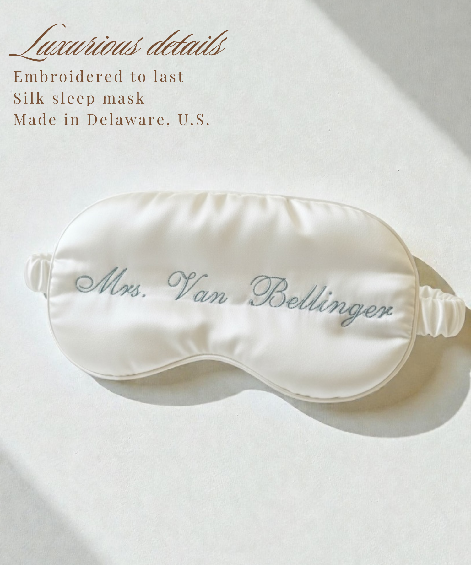This embroidered custom silk sleep eye mask features a name or monogram initials, making it a unique gift for engagements, bridal showers, girls trip gift, sweet sixteen sleepover favor, tween girl spa slumber party take away gift, bachelorette parties, or wedding weekend surprises. Soft and comfortable for sleeping, traveling, or relaxing, itβs both a fun keepsake and a practical accessory sheβll actually use.