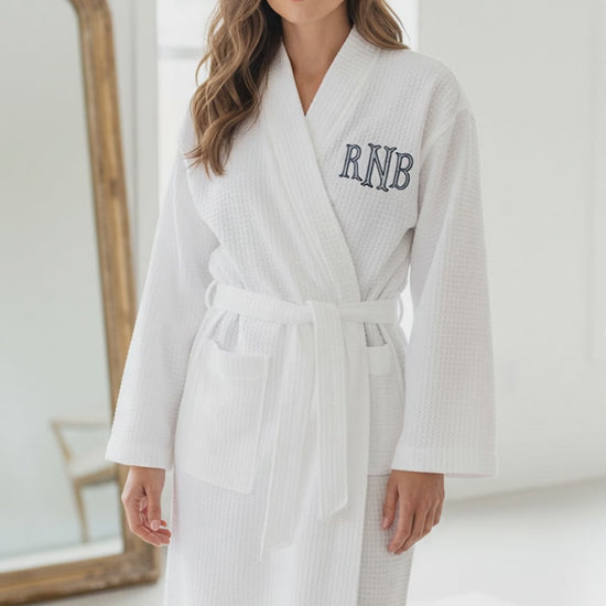 Celebrate your special moments in style with our custom embroidered white cotton waffle knit bridal robe. This lightweight spa-style robe is perfect for wedding morning makeup, bridal party getting ready photos, bachelorette spa girls weekend trip matching outfit, mother of the bride robe gift, and personalized bridesmaid gifts.